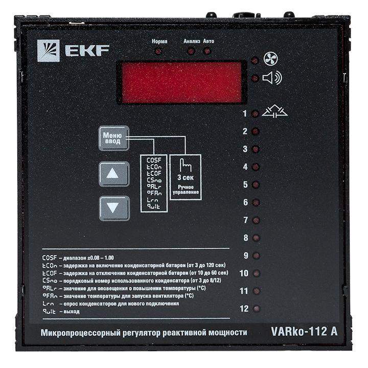 Регуляторы КРМ Varko EKF PROxima измеряют коэффициент мощности сети и управляют включением косинусных конденсаторов для удержания оптимального коэффициента мощности. Приборы обладают большим количеством функций. Регуляторы способны измерять гармонические искажения вплоть до 19 гармоник и защищать конденсаторы при увеличении допустимых значений сети. При этом подключение конденсаторов происходит таким образом, что в очередной раз подключается конденсаторы с наименьшим временем работы, таким образом увеличивается срок службы всей установки компенсации реактивной мощности.