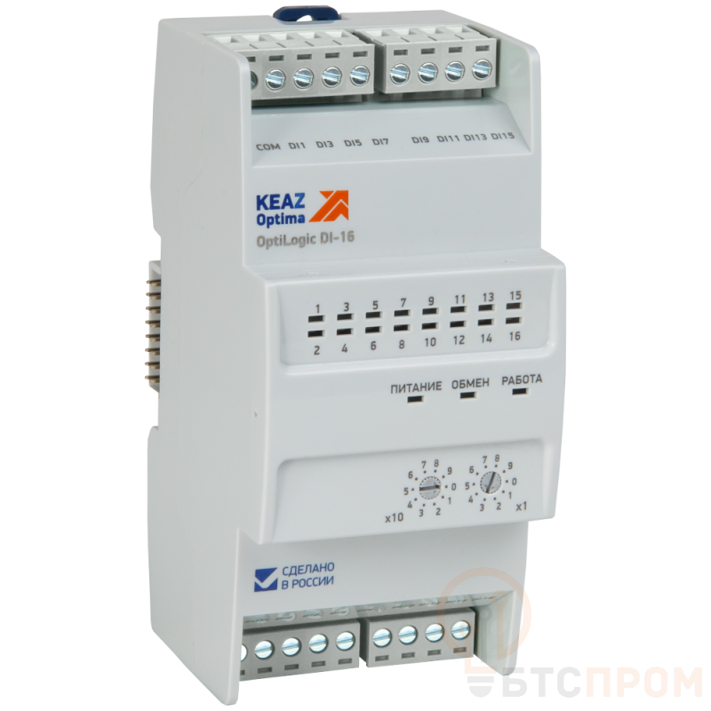Универсальный шестнадцатиканальный модуль дискретного ввода. Работает с сигналами 24 В постоянного напряжения любой полярности. Имеет прямую световую индикацию наличия сигнала на каждом входе и настройку режима антидребезга. Входы функционируют независимо в одном из трех режимов: «Дискретный вход», «Триггер», «Счетчик». В режиме «Счетчик» поддерживают частоту счета до 1 кГц. В режиме «Триггер» настройка срабатывания возможна как по переднему фронту, так и по заднему фронту. Все входы гальванически изолированы. Поддерживает «горячую замену». Удобные клеммники обеспечивают простоту подключения. Адрес Modbus устанавливается микропереключателями на передней панели устройства. Скорость передачи данных по внутренней шине – 1 Мбит/с. Модуль может использоваться как отдельное Modbus-устройство при условии подключения через модуль расширения шины OptiLogic L-BE-1. Рабочий температурный диапазон – от -40оС до +55 оС. Встроенное ПО поставляется в составе оборудования и отдельно не продается.