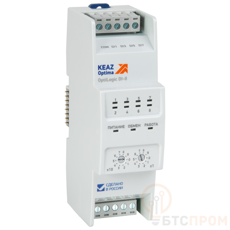 Универсальный восьмиканальный модуль дискретного ввода. Работает с сигналами 24 В постоянного напряжения любой полярности. Имеет прямую световую индикацию наличия сигнала на каждом входе и настройку режима антидребезга. Входы функционируют независимо в одном из трех режимов: «Дискретный вход», «Триггер», «Счетчик». В режиме «Счетчик» поддерживают частоту счета до 1 кГц. В режиме «Триггер» настройка срабатывания возможна как по переднему фронту, так и по заднему фронту. Все входы гальванически изолированы. Поддерживает «горячую замену». Удобные клеммники обеспечивают простоту подключения. Адрес Modbus устанавливается микропереключателями на передней панели устройства. Скорость передачи данных по внутренней шине – 1 Мбит/с. Модуль может использоваться как отдельное Modbus-устройство при условии подключения через модуль расширения шины OptiLogic L-BE-1. Рабочий температурный диапазон – от -40оС до +55 оС. Встроенное ПО поставляется в составе оборудования и отдельно не продается.