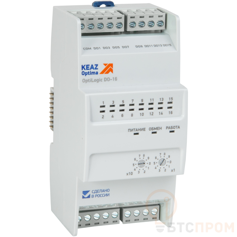 Универсальный шестнадцатиканальный модуль дискретного вывода. Выходы представляют собой защищенные токоподающие транзисторные выходы постоянного тока. Имеет световую индикацию управляющего сигнала каждого выхода. Два выхода из шестнадцати (DO1 и DO2) могут работать как генераторы ШИМ-сигнала (непрерывный или режим серии импульсов). Все четные и нечетные выходы имеют групповую защиту от перегрузки (КЗ) с записью события в регистры модуля. Поддерживает «горячую замену». Удобные клеммники обеспечивают простоту подключения. Адрес Modbus устанавливается микропереключателями на передней панели устройства. Скорость передачи данных по внутренней шине – 1 Мбит/с. Модуль может использоваться как отдельное Modbus-устройство при условии подключения через модуль расширения шины OptiLogic L-BE-1. Рабочий температурный диапазон – от -40оС до +55 оС. Встроенное ПО поставляется в составе оборудования и отдельно не продается.