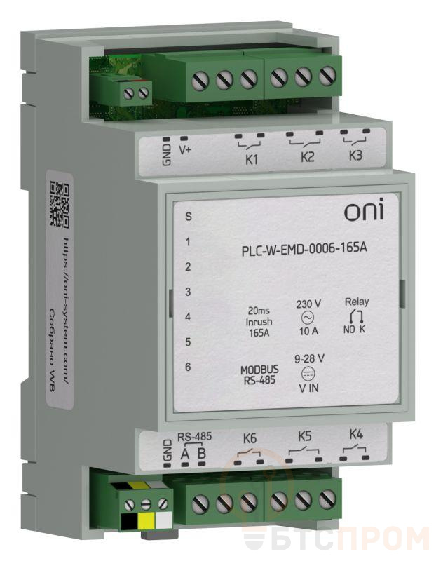 Модуль расширения входов/выходов для контроллеров PLC-W 6 DO 250В AC или 30 В DC максимальный коммутируемый ток для резистивной нагрузки — 10 А, максимальный пусковой ток 165А (в течение 20 мс). С коммуникацией Modbus RTU.