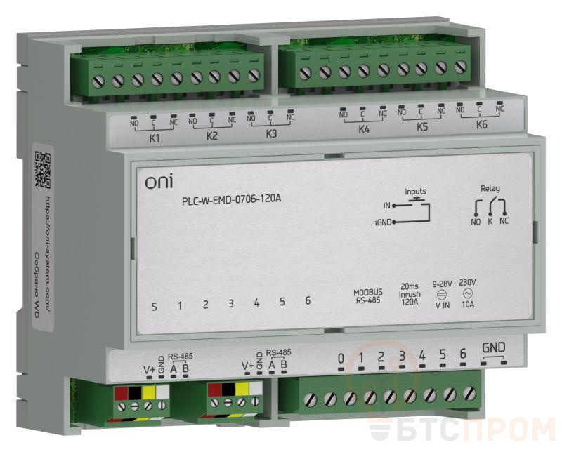Модуль расширения входов/выходов для контроллеров PLC-W 7 DI "сухой контакт", групповая изоляция и 6 DO 250В AC или 30 В DC максимальный коммутируемый ток для резистивной нагрузки — 10 А, максимальный пусковой ток 120А (в течение 20 мс, для контакта НО). С коммуникацией Modbus RTU.