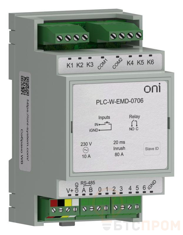 Модуль расширения входов/выходов для контроллеров PLC-W 7 DI "сухой контакт", групповая изоляция и 6 DO 250В AC или 30 В DC максимальный коммутируемый ток для резистивной нагрузки — 10 А, максимальный пусковой ток 80А (в течение 20 мс, для контакта НО). С коммуникацией Modbus RTU.