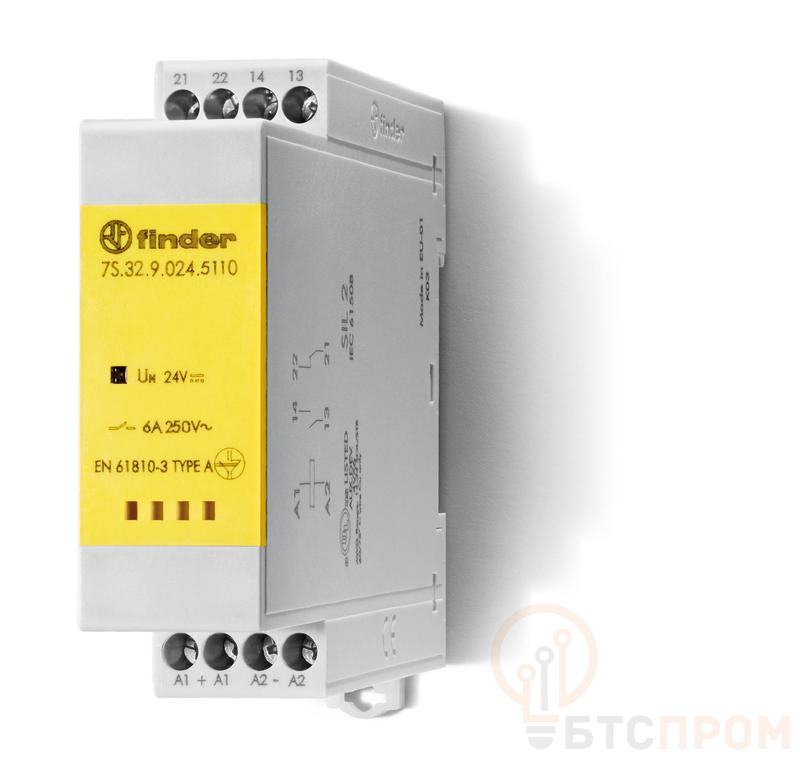 Реле безопасности 7S.32 от FINDER — это модульное электромеханическое реле с принудительным размыканием контактов (положительным размыканием), обеспечивающее высокий уровень безопасности и надежности в промышленных системах управления. Устройство оснащено одной нормально разомкнутой (1NO) и одной нормально замкнутой (1NC) контактной группой, рассчитанной на коммутацию нагрузки до 6 А. Контакты выполнены из сплава серебра и никеля с покрытием золотом (AgNi+Au), что гарантирует низкое переходное сопротивление, высокую износостойкость и стабильную работу даже при низковольтных нагрузках.