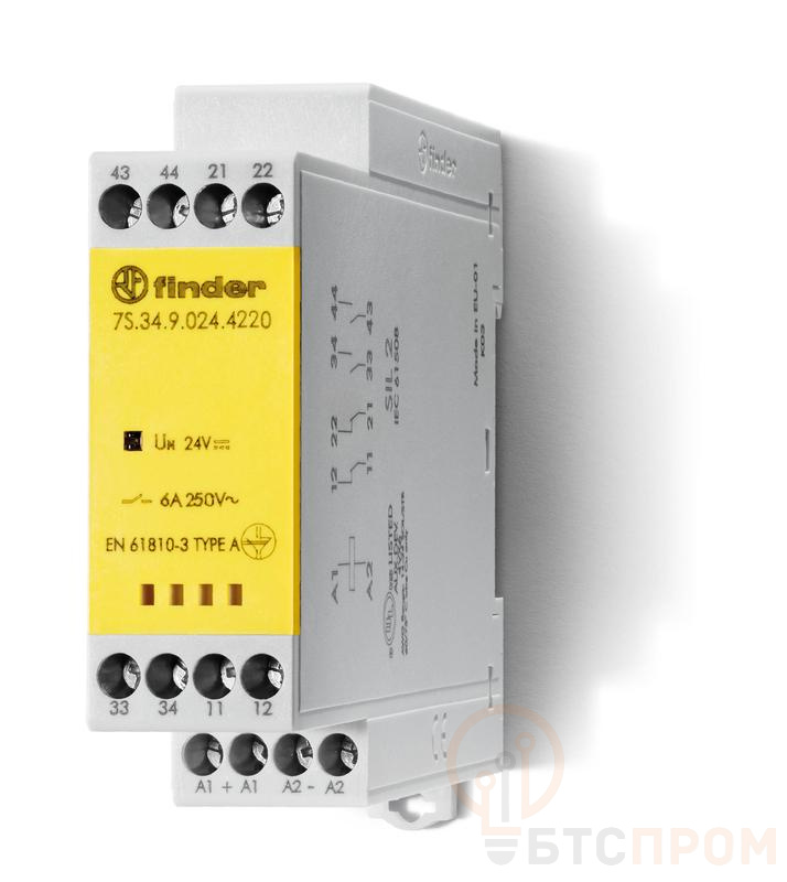 Реле безопасности FINDER 7S.34 — это модульное электромеханическое устройство с принудительным размыканием контактов (положительным разрывом), что гарантирует высокий уровень защиты персонала и оборудования. Модель 7S3490484310PAS оснащена тремя нормально разомкнутыми (3NO) и одним нормально замкнутым (1NC) контактами, рассчитанными на коммутацию нагрузки до 6 А. Контакты выполнены из долговечного материала AgSnO2 (серебро-оксид олова), обеспечивающего высокую стойкость к дугообразованию и износу.