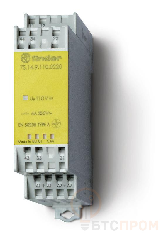 Реле безопасности модульное электромеханич. (реле с принудительным управлением контактами) 3NO+1NC 6А AgSnO2 110В DC безвинт. клеммы 22.5мм IP54 версия для ЖД-транспорта FINDER 7S1491104310T