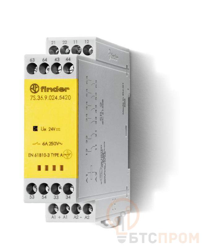 Реле безопасности модульное электромеханич. (реле с принудительным управлением контактами) SIL2 4NO+2NC 6А AgNi+Au 12В DC винт. клеммы Ш=22.5мм IP20 FINDER 7S3690125420PAS