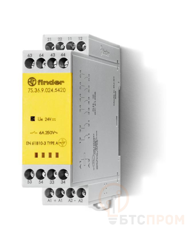 Реле безопасности модульное электромеханич. (реле с принудительным управлением контактами) 4NO+2NC 6А AgNi+Au 12В DC винт. клеммы 22.5мм IP54 FINDER 7S3690125420