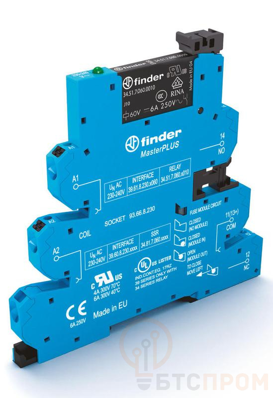 Модуль интерфейсный (сборка 34.51.7.024.0010 + 93.66.0.240) электромеханич. реле MasterPLUS 1CO 6А 24-240В AC/DC IP20 безвинт. клеммы Push-in FINDER 396102400060