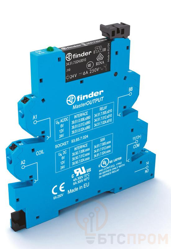 Модуль интерфейсный (сборка 34.51.7.060.0010 + 93.65.0.125) электромеханич. реле серия MasterOUTPUT 1NO 6А 125В AC/DC IP20 безвинт. клеммы Push-in FINDER 395101250060