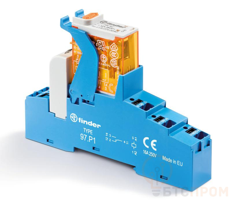 Модуль интерфейсный (сборка 46.61.8.012.0040 + 99.02.0.024.98 + 97.P1SPA) электромеханич. реле 1CO 16А AgNi 12В AC IP20 безвинт. клеммы Push-in пластик. клипса LED + варистор кнопка тест + мех.индикатор FINDER 4CP180120060SPA