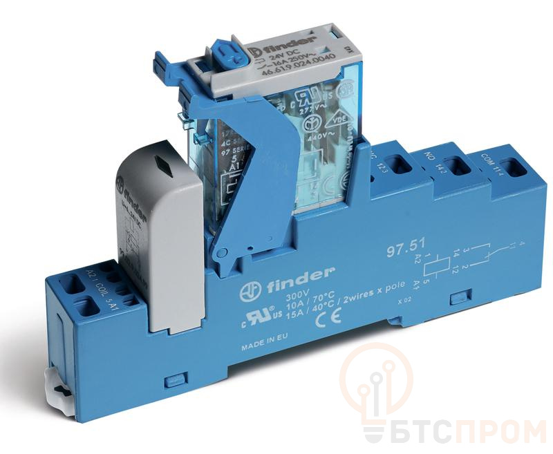 Модуль интерфейсный (сборка 46.61.9.024.0040 + 99.02.9.024.99 + 97.51SPA) электромеханич. реле 1CO 16А AgNi 24В DC IP20 безвинт. клеммы (пружинный зажим) пластик. клипса LED + диод кнопка тест + мех.индикатор FINDER 4C5190240050SPA