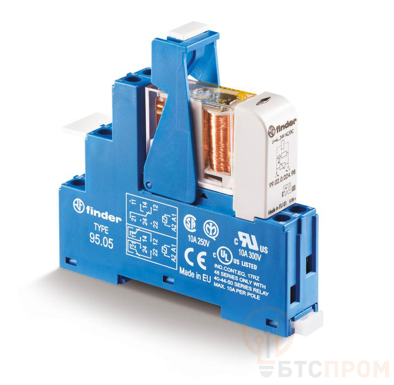 Модуль интерфейсный (сборка 50.12.9.024.5000 + 99.02.9.024.99 + 95.05SPA) электромеханич. реле 2CO 8А AgNi+Au 24В DC IP20 винт. клеммы пластик. клипса LED + варистор FINDER 483290245060SPA