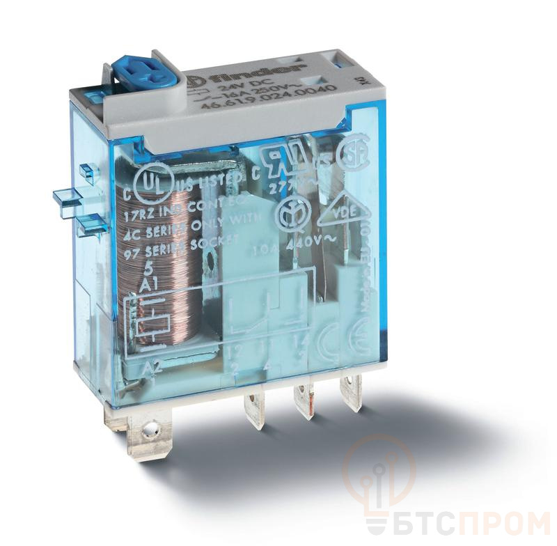 Реле миниатюрное промышленное электромеханич. монтаж в розетку или наконечники Faston (4.8х0.5мм) 1CO 16А AgNi 12В AC влагозащ. RTII опции: кнопка тест + мех. индикатор + LED(AC) FINDER 466180120054