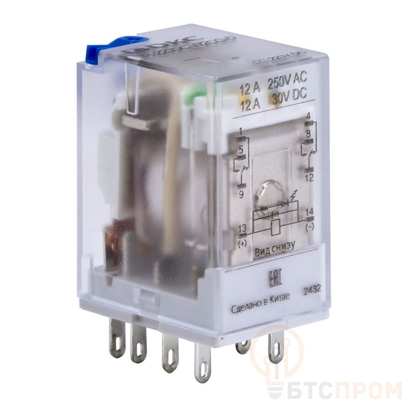 Реле миниатюрное промышленное общего назначения на 2 контактные группы. Предназначено для коммутации электрических схем. Коммутируемый ток составляет 12 А, напряжение питания катушки 24 В DС. Для удобства в реле встроены кнопка-тест с блокировкой, защитный диод и светодиодная индикация. Установка в колодку.