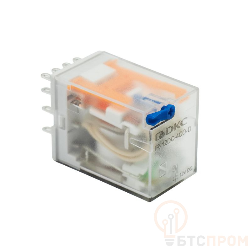 Реле миниатюрное промышленное общего назначения 4CO ком. ток 6А AgSnO2 напряжение 12В DC опция: тест-кнопка+светодиод+защитный диод DKC IR-12DC-4CO-D