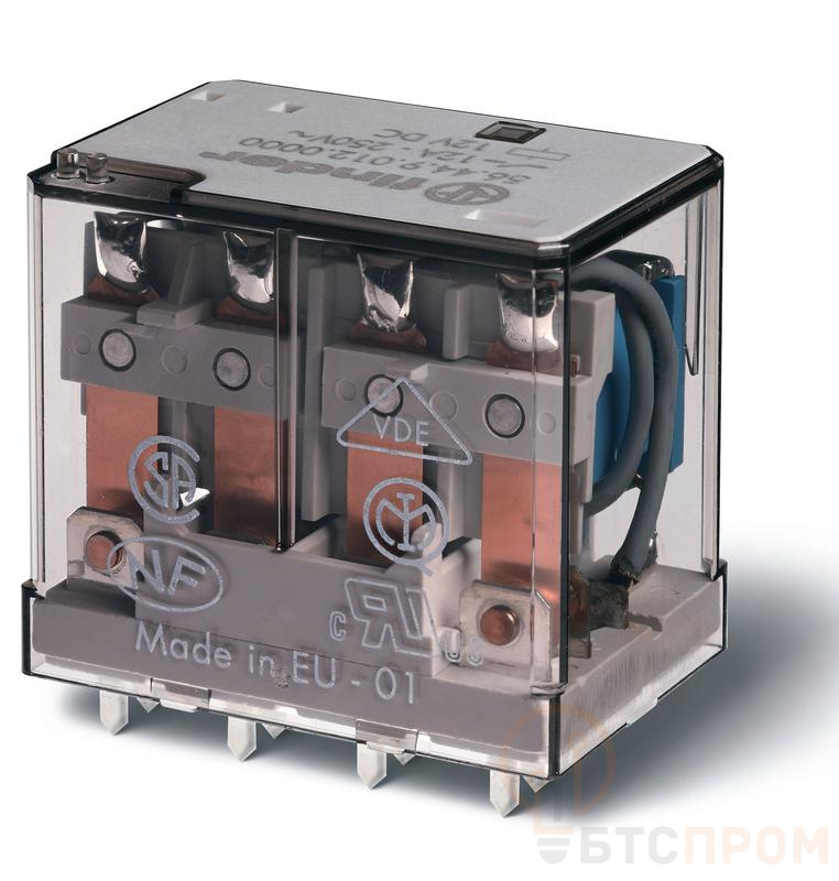 Миниатюрное силовое электромеханическое реле FINDER серии 56 — это надежный и компактный коммутационный прибор, предназначенный для монтажа непосредственно на печатную плату. Устройство обладает 4 группами переключающих контактов (4CO) с номинальным током коммутации до 12А, что позволяет управлять значительными нагрузками. Контакты выполнены из сплава серебро-никель (AgNi), обеспечивающего высокую износостойкость и стабильное низкое переходное сопротивление.