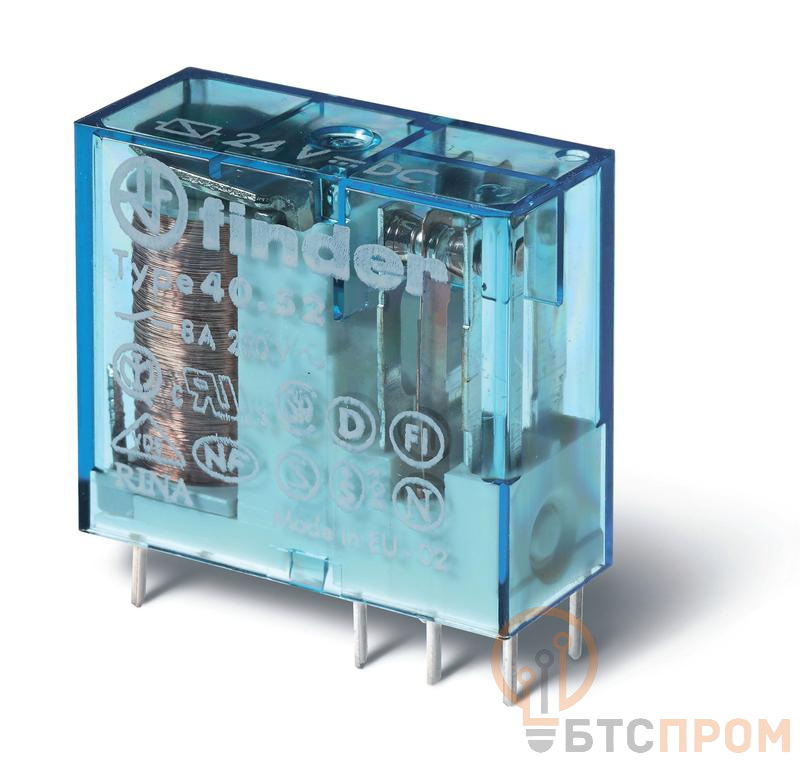 Миниатюрное универсальное электромеханическое реле FINDER серии 40 — это компактное и надежное решение для управления нагрузками в цепях переменного и постоянного тока. Модель 40.52.0.024.2000 обладает бистабильной (импульсной) конфигурацией с двумя перекидными контактами (2CO), что позволяет сохранять последнее состояние после снятия управляющего сигнала. Номинальный ток коммутации составляет до 8А, контакты выполнены из долговечного материала серебро-кадмий оксид (AgCdO), обеспечивающего низкое переходное сопротивление и стойкость к дугообразованию. Реле рассчитано на напряжение катушки 24В AC/DC, что делает его универсальным для различных источников питания. Благодаря шагу выводов 5 мм возможен монтаж как на печатную плату, так и в стандартную розетку для реле. Широко применяется в системах автоматизации, управления освещением, вентиляцией, в промышленной и бытовой аппаратуре, а также в цепях безопасности. Поставляется в удобной упаковке по 10 штук.