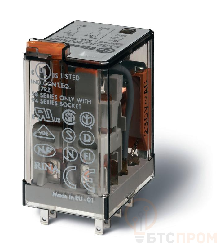 Реле миниатюрное универсальное электромеханич. монтаж в розетку 2CO 10А AgNi 230В AC RTI опции: кнопка тест + мех. индикатор FINDER 553282300040PAS