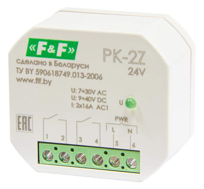 Реле промежуточное PK-2Z/24 7-30 AC 9-40 DC 16А для установки в монтажную коробку d60мм 2NO IP20 F&F EA06.001.048