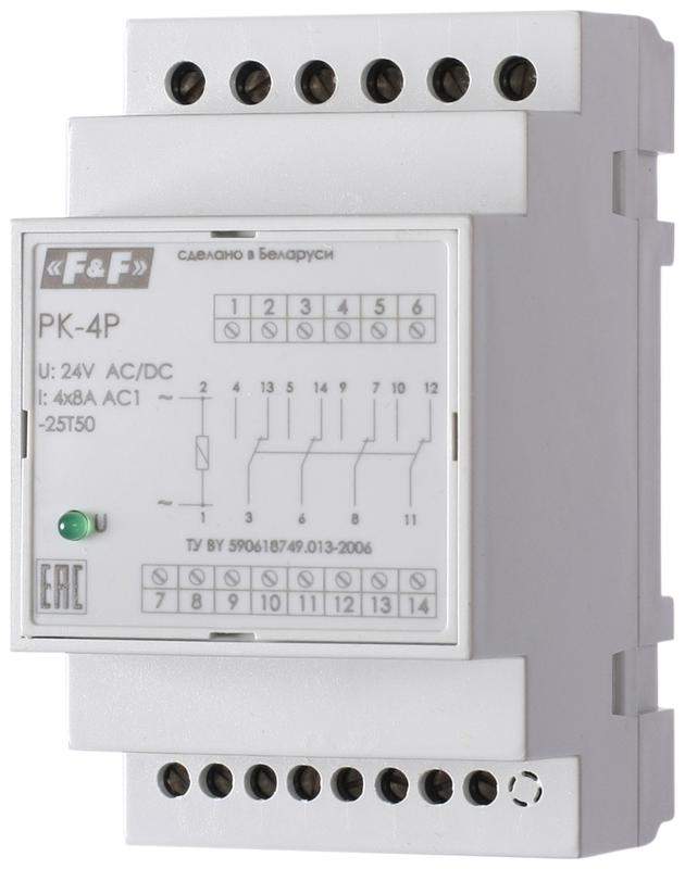 Реле промежуточное серии PK Монтаж на DIN-рейку. Для гальванической развязки между силовыми цепями и цепями управления, дистанционного включения нагрузки путем подачи управляющего напряжения на вход реле, а также использования в качестве промежуточных реле. Переключение контактов реле осуществляется подачей управляющего напряжения на контакты 1-2, при этом на лицевой панели загорается индикатор включения реле. Особенности: напряжение питания - 230 В AC; максимальный ток нагрузки - 4x8 А; контакт - 4NO/NC.