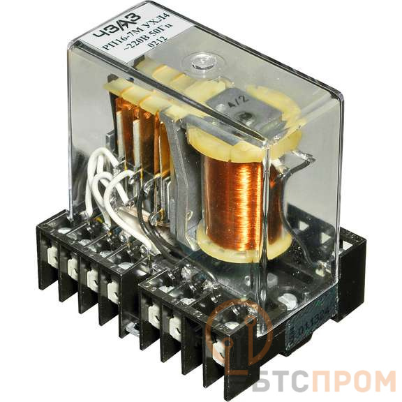 Промежуточное реле РП-16-7М от производителя ЧЭАЗ — это надежный и универсальный коммутационный аппарат, предназначенный для работы в цепях управления и автоматики. Устройство рассчитано на номинальное напряжение 220 В переменного тока частотой 50 Гц.