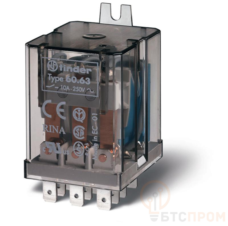 Реле универсальное электромеханич. монтаж в наконечники Faston 187 (4.8х0.8мм) 3CO 10А AgNi 115В AC RTI боковой монтаж. фланец опции: нет FINDER 606381150000