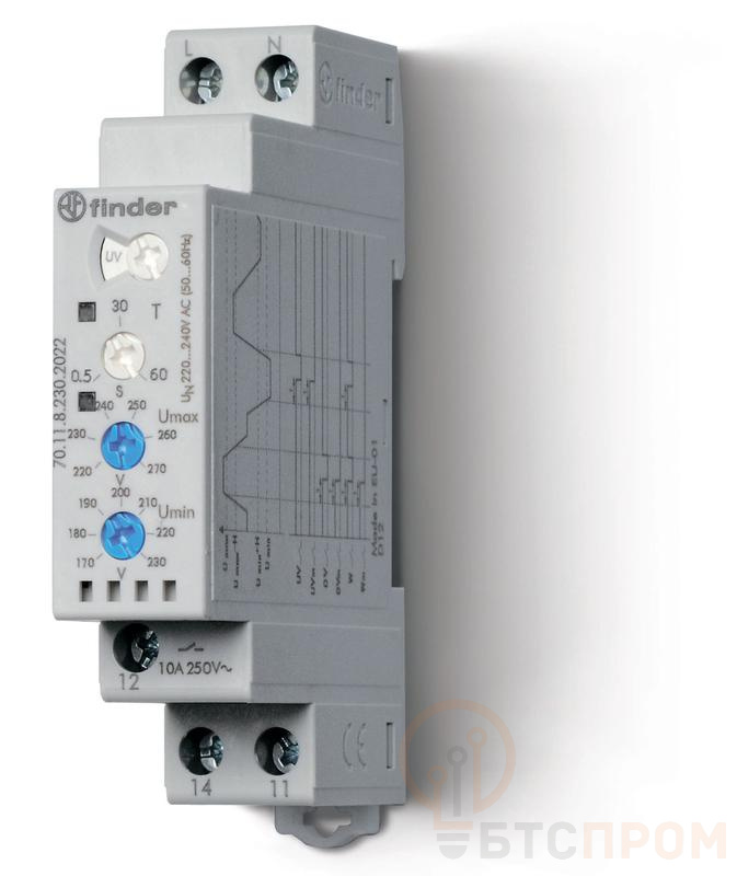 Реле контрольное для 1-фазных сетей пониженное/повышенное напряжение настраиваемые диапазоны выход 1CO 10А модул. шир. 17.5мм FINDER 701182302022