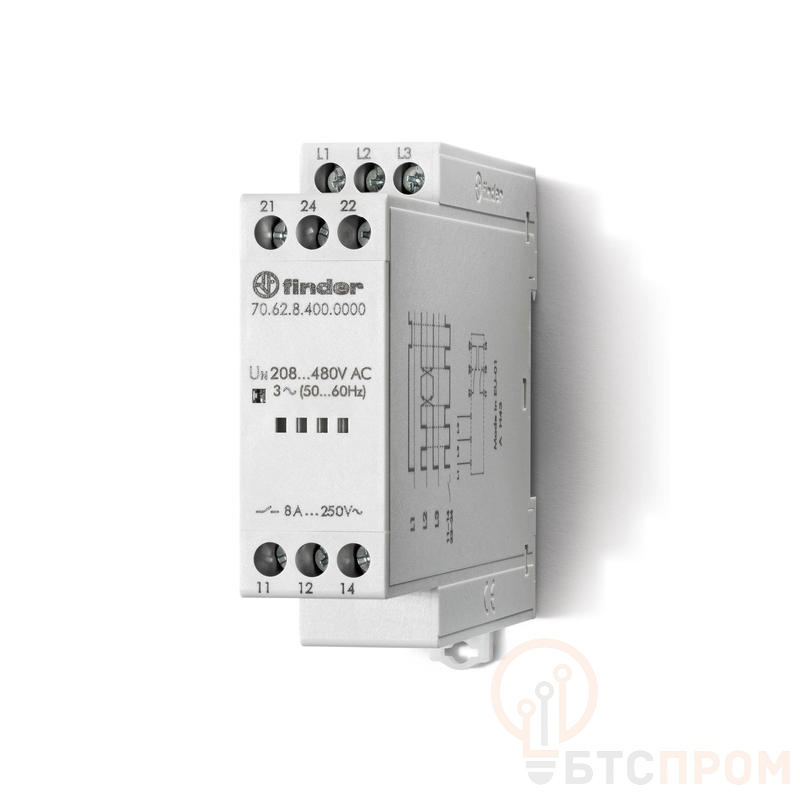 Реле контрольное для 3ф сетей обрыв/чередование фаз фиксир. регулировки выход 2CO 8А модульное 22.5мм IP20 спец. версия для Ж/Д-транспорта FINDER 706284000000T