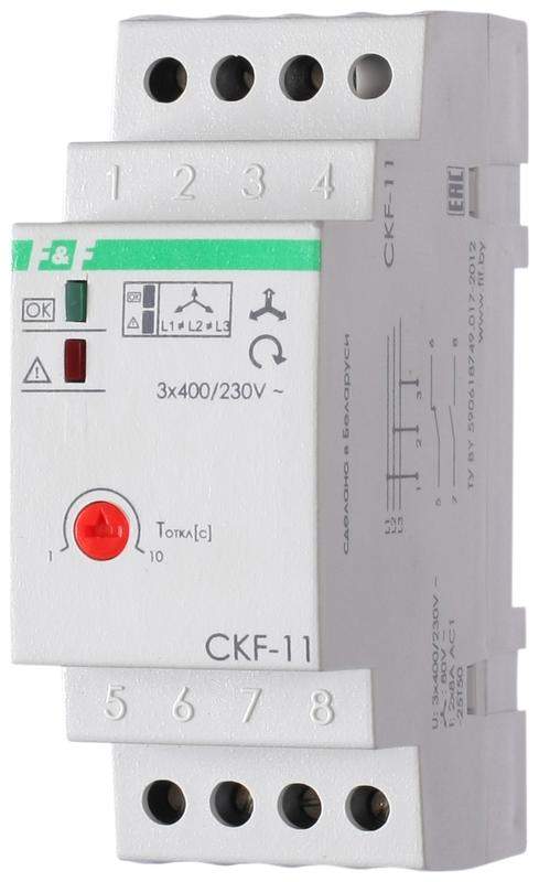 Реле контроля фаз для сетей с изолированной нейтралью CKF-11 (монтаж на DIN-рейке 35мм; регулировка задержки отключения; контроль чередования фаз; 3х400В 8А 1Z 1R IP20)(аналог ЕЛ-11Е) F&F EA04.004.003