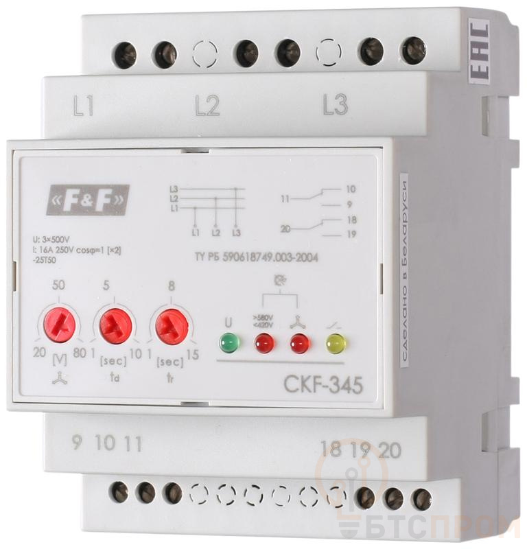 Реле контроля фаз для сетей с изолированной нейтралью CKF-345 (монтаж на DIN-рейке 35мм; регулировка порога отключения; контроль чередования фаз; 3х500В 2х8А 1х2P IP20) F&F EA04.004.001