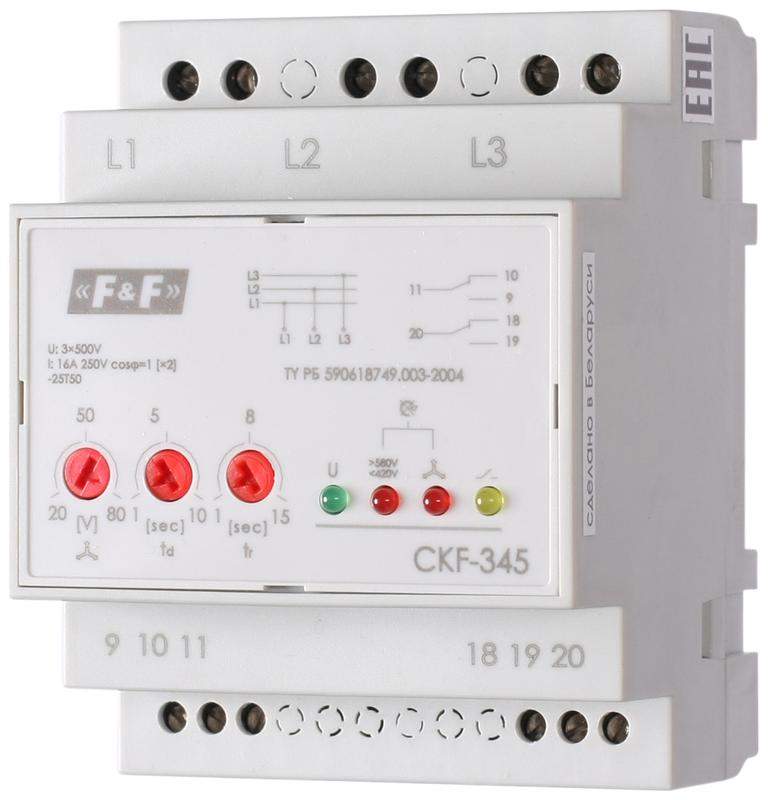 Реле контроля фаз серии "CKF" Монтаж на DIN-рейку. Предназначено для защиты электродвигателей и электроустановок, питаемых от трехфазной сети в случаях: отсутствия хотя бы одной из фаз, асимметрии напряжения, снижения напряжения менее 420 В, повышения напряжения более 580 В, нарушении чередования фаз. Принцип работы Если напряжение в пределах нормы, контакты исполнительного реле замкнуты и на контактор управления электродвигателем подается напряжение, управляющее его включением. В случае одной из вышеперечисленных аварийных ситуаций контакты реле размыкаются и контактор отключается. Включение происходит автоматически после восстановления сетевого напряжения питания. Особенности: контроль наличия фаз; контроль асимметрии между фазами; контроль нижнего значения напряжения; контроль верхнего значения напряжения; контроль чередования фаз; напряжение питания 3x500 В AC; контакт - 2NO/NC