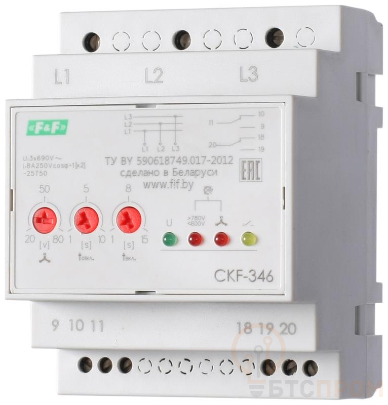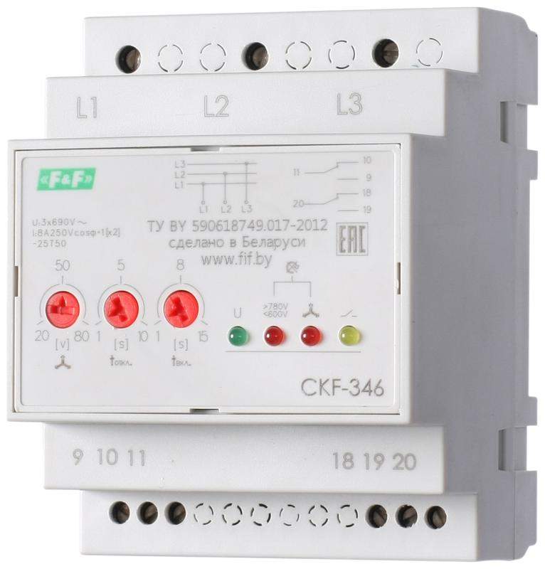Реле контроля фаз для сетей с изолированной нейтралью CKF-346 (монтаж на DIN-рейке 35мм; регулировка порога отключения; контроль чередования фаз; 3х680В 2х8А 1х2P IP20) F&F EA04.004.002
