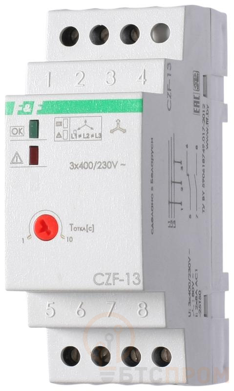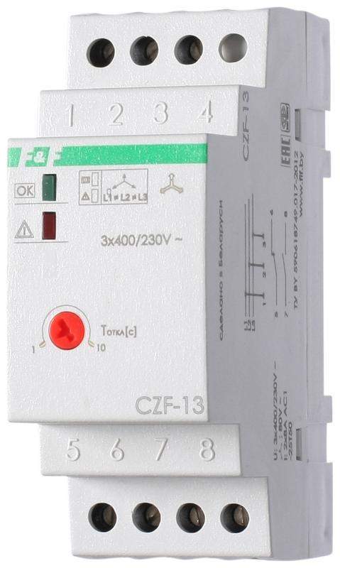 Реле контроля фаз для сетей с изолированной нейтралью CZF-13 (монтаж на DIN-рейке 35мм; регулировка задержки отключения; 3х400В 8А 1Z 1R IP20) F&F EA04.004.004