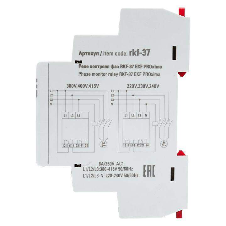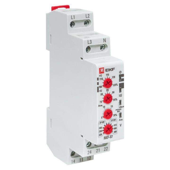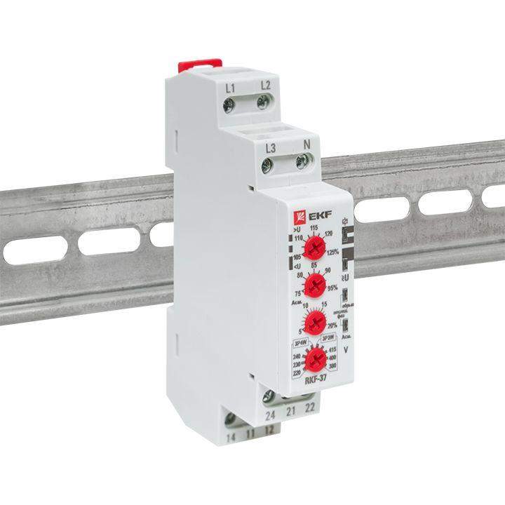 Реле контроля фаз RKF является механическими коммутационным аппаратом, который предназначается для контроля уровня напряжения в трехфазных сетях переменного тока и защитного отключения нагрузки в случае падения или повышения напряжения электрической сети сверх допустимого значения, а также в случае обрыва фазы, неверной последовательности фаз и асимметрии. Данные реле отличаются компактными размерами и универсальностью применения в трех- и четырехпроводных схемах. Реле контролирует следующие параметры: отсутствие фаз, падение напряжения, повышение напряжения, асимметрия напряжения с выдержкой времени срабатывания, чередование фаз.