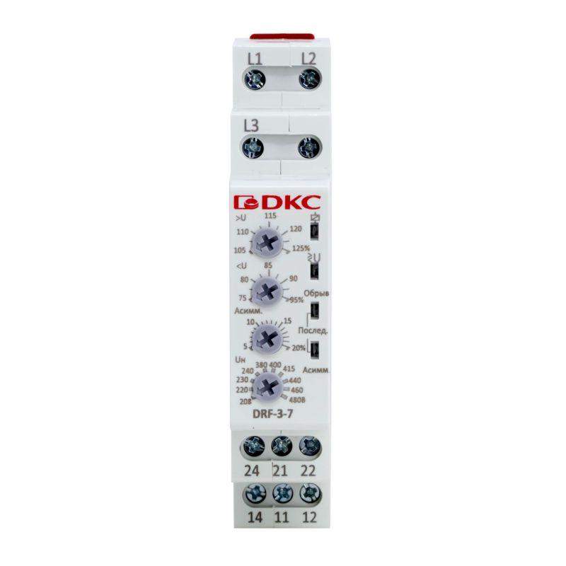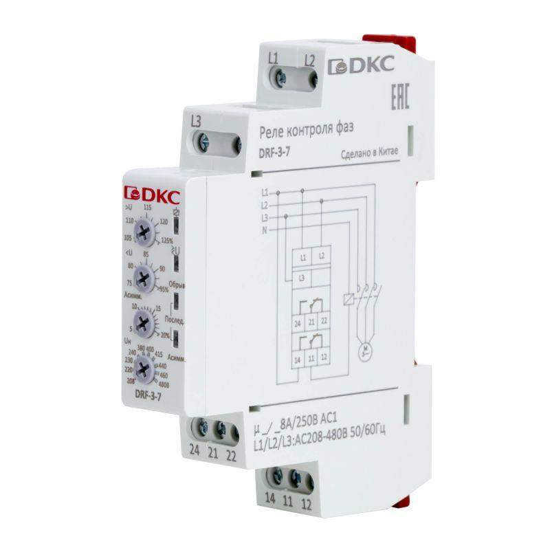 Реле контроля фаз тип DRF контроль напряжения обрыва фаз чередования фаз асимметрии конфигурация контакта 2CO.208-480В 3ф DKC DRF-3-7
