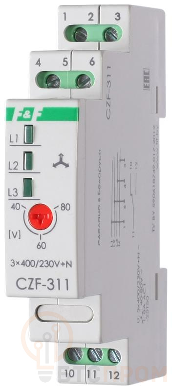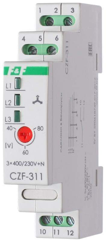 Реле контроля фаз серии "CZF" Монтаж на DIN-рейку. Предназначено для защиты электродвигателей и электроустановок, питаемых от трехфазной сети в случаях: отсутствия хотя бы одной из фаз, асимметрии напряжения, снижения напряжения менее 160 В, обрыва нулевого провода. Принцип работы Если напряжение в пределах нормы, контакты исполнительного реле замкнуты и на контактор управления электродвигателем подается напряжение, управляющее его включением. В случае одной из вышеперечисленных аварийных ситуаций контакты реле размыкаются и контактор отключается. Включение происходит автоматически после восстановления сетевого напряжения питания. Особенности: контроль наличия фаз; контроль асимметрии между фазами; контроль нижнего значения напряжения; защита от обрыва нулевого провода; напряжение питания 3x230+N В AC; контакт - 1NO/NC (8 А).