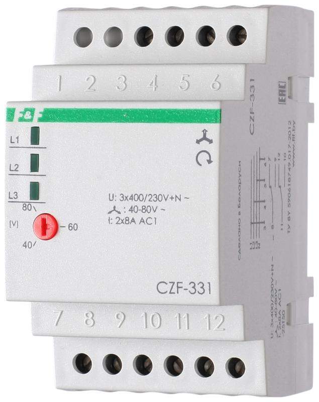 Реле контроля и наличия фаз CZF-331 (монтаж на DIN-рейке 35мм; регулировка порога отключения; 3х400/230+N 2х8А 2P IP20) F&F EA04.001.008