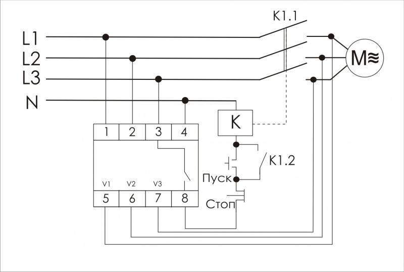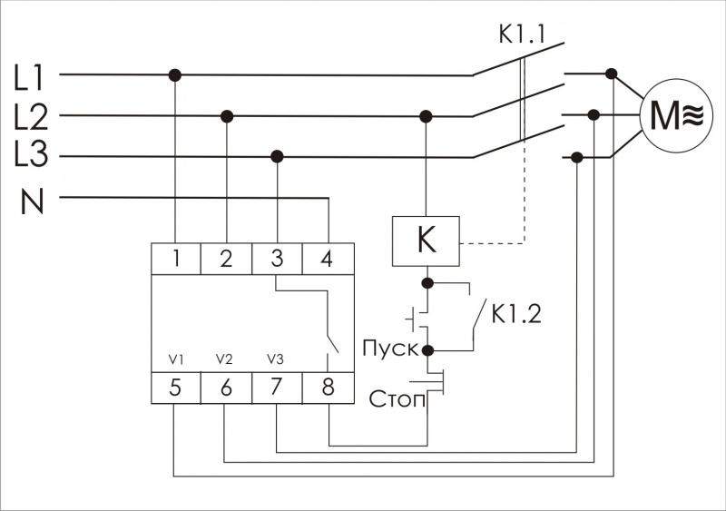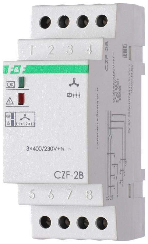 Реле контроля фаз серии "CZF" Монтаж на DIN-рейку. Предназначено для защиты электродвигателей и электроустановок, питаемых от трехфазной сети в случаях: отсутствия хотя бы одной из фаз, асимметрии напряжения, снижения напряжения менее 160 В,повреждения контактов контактора, обрыва нулевого провода. Принцип работы Если напряжение в пределах нормы, контакты исполнительного реле замкнуты и на контактор управления электродвигателем подается напряжение, управляющее его включением. В случае одной из вышеперечисленных аварийных ситуаций контакты реле размыкаются и контактор отключается. Включение происходит автоматически после восстановления сетевого напряжения питания. Особенности: Контроль наличия фаз; Контроль асимметрии между фазами; Контроль нижнего значения напряжения; Контроль состояния контактора; защита от обрыва нулевого провода; напряжение питания 3x400/230+N В AC; контакт - 1NO (8 А).