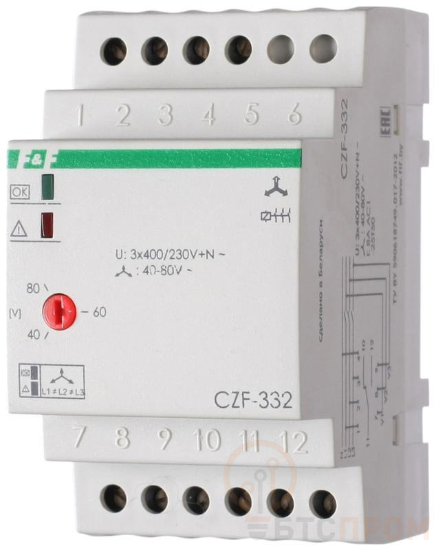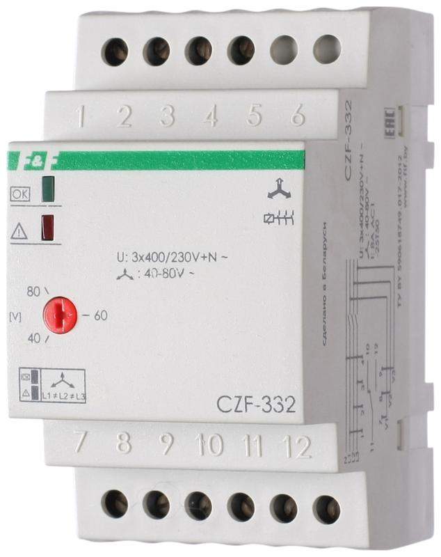 Реле контроля наличия фаз CZF-332 (монтаж на DIN-рейке 35мм; регулировка порога отключения; 3х400/230+N 8А 1P IP20) F&F EA04.003.004