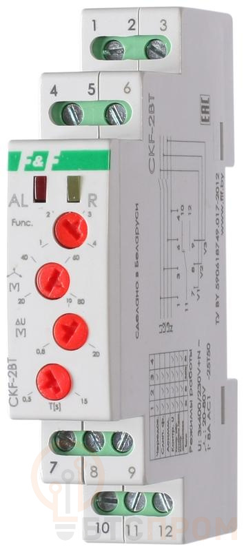 Реле контроля наличия фаз и состояния контактора CKF-2BT (контроль чередования; слипания фаз; регулировка задержки отключ. и порога асимметрии; контроль нижн. и верх. порогов напряжения; 1 модуль; монтаж на DIN-рейке) F&F EA04.003.005