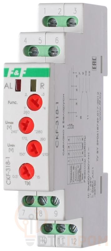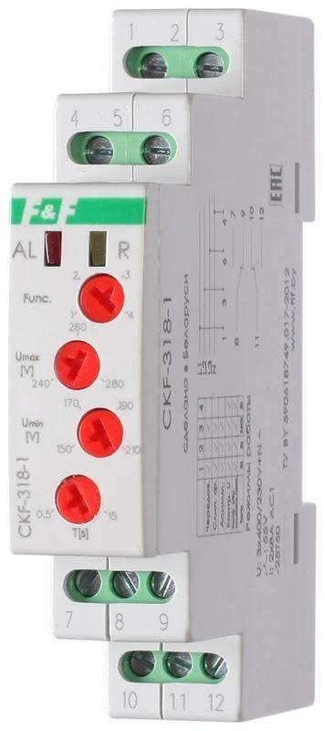 Реле контроля наличия и чередования фаз CKF-318-1 (контроль чередования; слипания фаз; регулировка верх. и нижн. порога напряжения; регулировка задержки отключения; 1 модуль; монтаж на DIN-рейке)(аналог РНПП-311М) F&F EA04.002.007