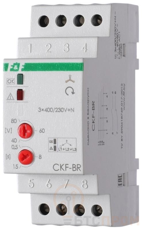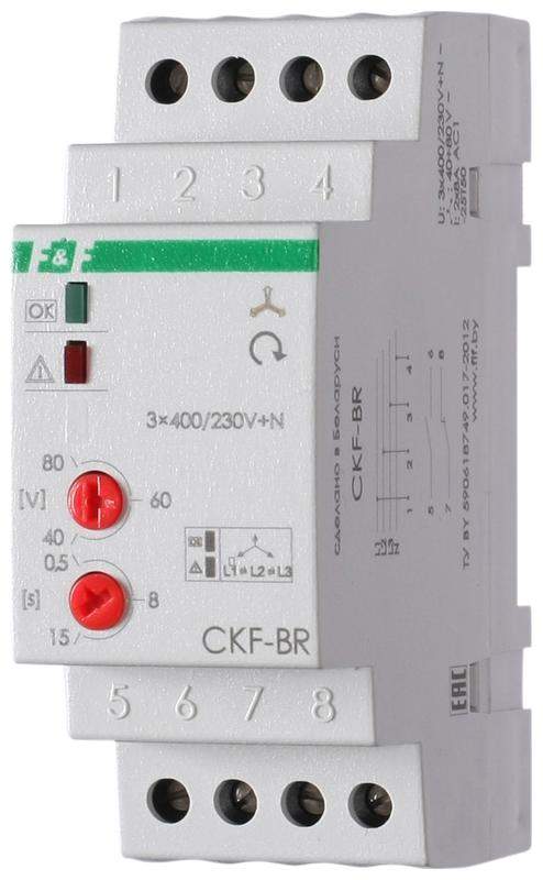 Реле контроля наличия и чередования фаз CKF-BR (монтаж на DIN-рейке 35мм; регулировка порога отключения; регулировка времени отключения; 3х400/230+N 2х8А 1Z 1R IP20) F&F EA04.002.003