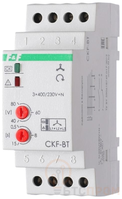 Реле контроля наличия и чередования фаз CKF-BT (монтаж на DIN-рейке 35мм; микропроцессорный; регулировка порога отключения и времени отключения; контроль верхнего и нижнего значений напряжения; 3х400/230+N 2х8А 1Z 1R IP20) F&F EA04.002.004