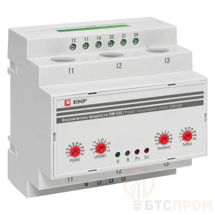 Ограничители мощности ОМ-3, ОМ-14 ОМ-630 EKF PROxima – это чувствительные приборы, которые отключат оборудование при выходе потребляемой мощности за допустимые значения. В функции ОМ-3 и ОМ-630 входит измерение мощности в одно и трёхфазных сетях соответственно и срабатывание при превышении заданного параметра. ОМ-14 обладает расширенным функционалом. Это устройство с удобным управлением и двумя цифровыми дисплеями измеряет активную, реактивную и полную мощности в однофазной сети, а также работает в режимах вольтметра и амперметра. ОМ-14 отключает оборудование при превышении порога мощности, защищает его от повышенного и пониженного напряжения. Чтобы подключить ОМ-14 в сети с током до 63А не потребуется устанавливать дополнительный контактор. Благодаря встроенному трансформатору прибор рассчитан на максимальный ток 80А. Особенности ограничителя мощности ОМ-630 EKF PROxima: - трансформаторное подключение и измерение мощности до 50 кВт, а так же управление 2-мя ступенями. Гарантия на все устройства составляет 7 лет.