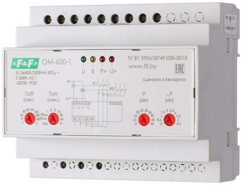 Ограничитель мощности OM-630-1 (трехфазный; многофункциональный; 5-50кВт; функция реле напряжения; 2NO/NC 2х8А USB порт для установки параметров; монтаж на DIN-рейке) F&F EA03.001.008