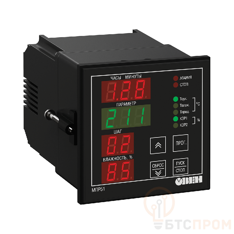 Измеритель-регулятор температуры и влажности МПР51-Щ4.03.RS от ОВЕН — это многофункциональный прибор, предназначенный для точного контроля микроклимата в различных условиях. Устройство оснащено двумя входами для подключения датчиков температуры и влажности, что позволяет ему одновременно измерять и регулировать два ключевых параметра.
