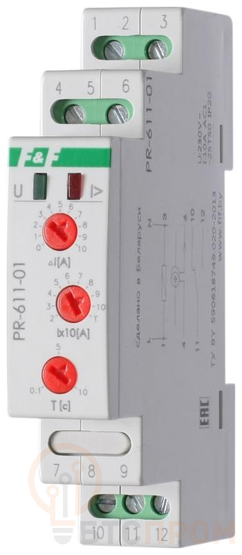 Реле тока РR-611-01 (исп.1 (20-110А); с задержкой отключения; монтаж на DIN-рейке 35мм 230В 10А IP20) F&F EA03.004.003