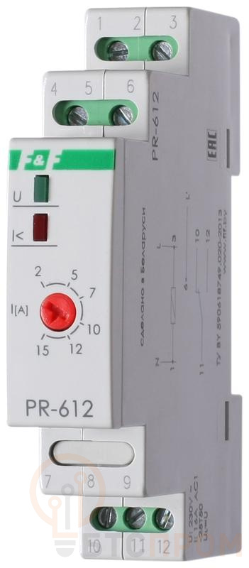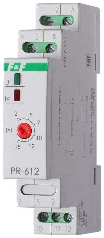 Реле тока серии ""PR" Монтаж на DIN-рейку. Для отключения неприоритетной нагрузки при превышении установленного значения потребляемого тока, а потребители приоритетной цепи остаются подключенными к питающей сети. Потенциометром на передней панели изделия устанавливается величина тока, при превышении которой отключается неприоритетная нагрузка. Если значение тока в приоритетной цепи не превышает установленное значение, контакты реле 11-12 замкнуты и неприоритетная нагрузка подключена к сети питания. Если измеренное значение тока превысит установленное пороговое значение, контакты 11-12 размыкаются и неприоритетная нагрузка отключается. При снижении величины потребляемого тока в приоритетной цепи реле автоматически подключает неприоритетную цепь (нагрузку) к сети питания. Применяется в случаях, когда одновременная работа всех потребителей приводит к перегрузке питающей сети (ввод электропитания рассчитан на меньшую мощность, чем мощность потребителей, лимит потребления электроэнергии и пр.). Особенности: напряжение питания - 230 В AC; диапазон контролируемых токов 2…15 А; максимальный ток нагрузки - 16 А; контакт - 1NO/NC."
