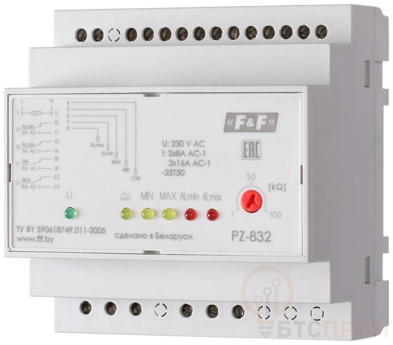 Реле уровня PZ-832 (без датчиков 4-х уровневый контроль аварийных макс. и мин. уровней монтаж на DIN-рейке 35мм 230В AC 2х8А + 2х16А 2перекл. + 2НО IP20) F&F EA08.001.012